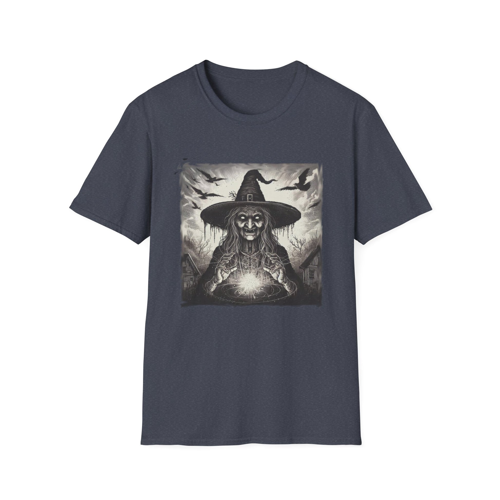 Unleash the spirit of Halloween with this eerie men’s graphic t-shirt featuring a chilling witch silhouette against a haunted house backdrop, complete with flying bats and a mystical full moon. Perfect for Halloween parties or as a ghoulish addition to your everyday wardrobe. Ideal for those who love to embrace the spooky season in style.