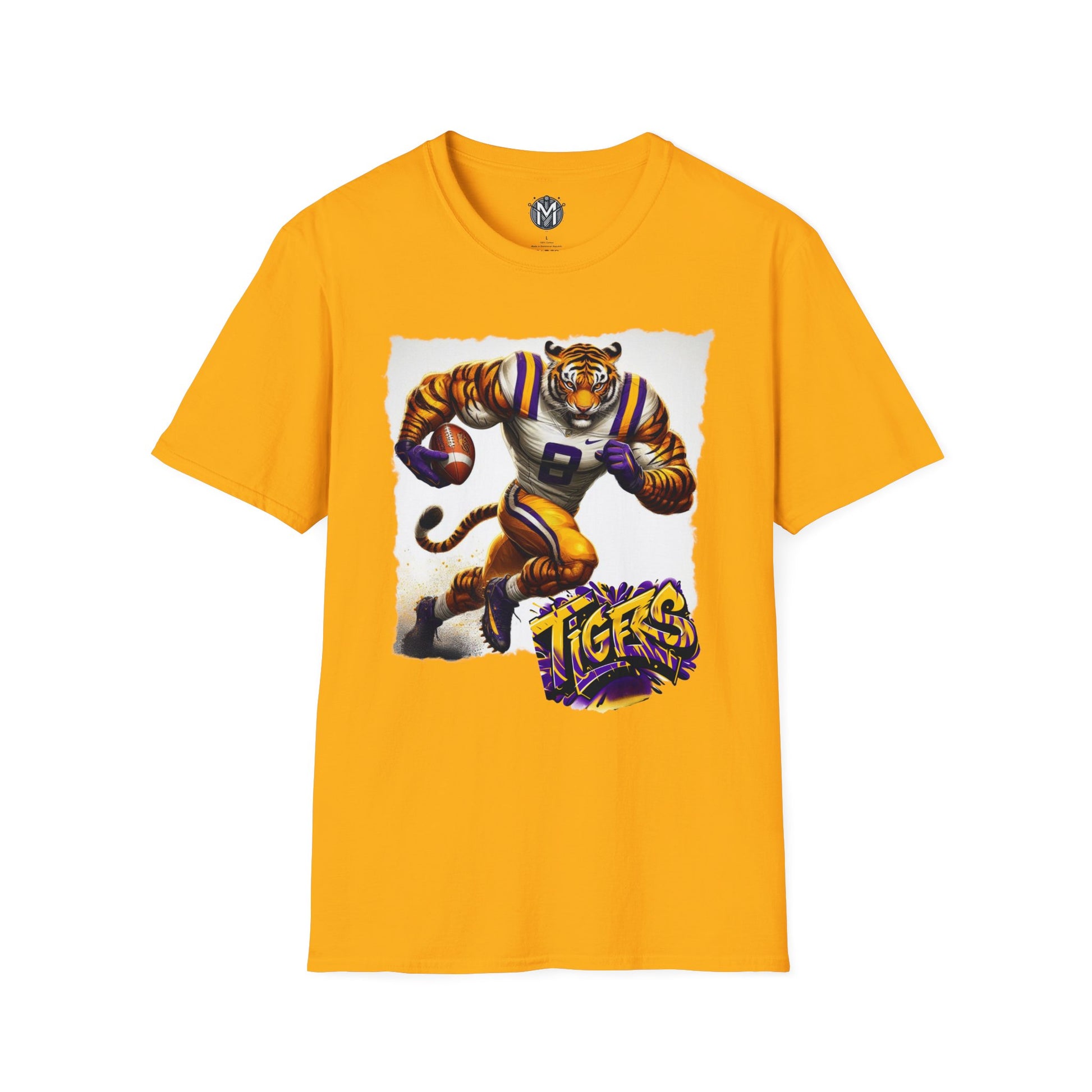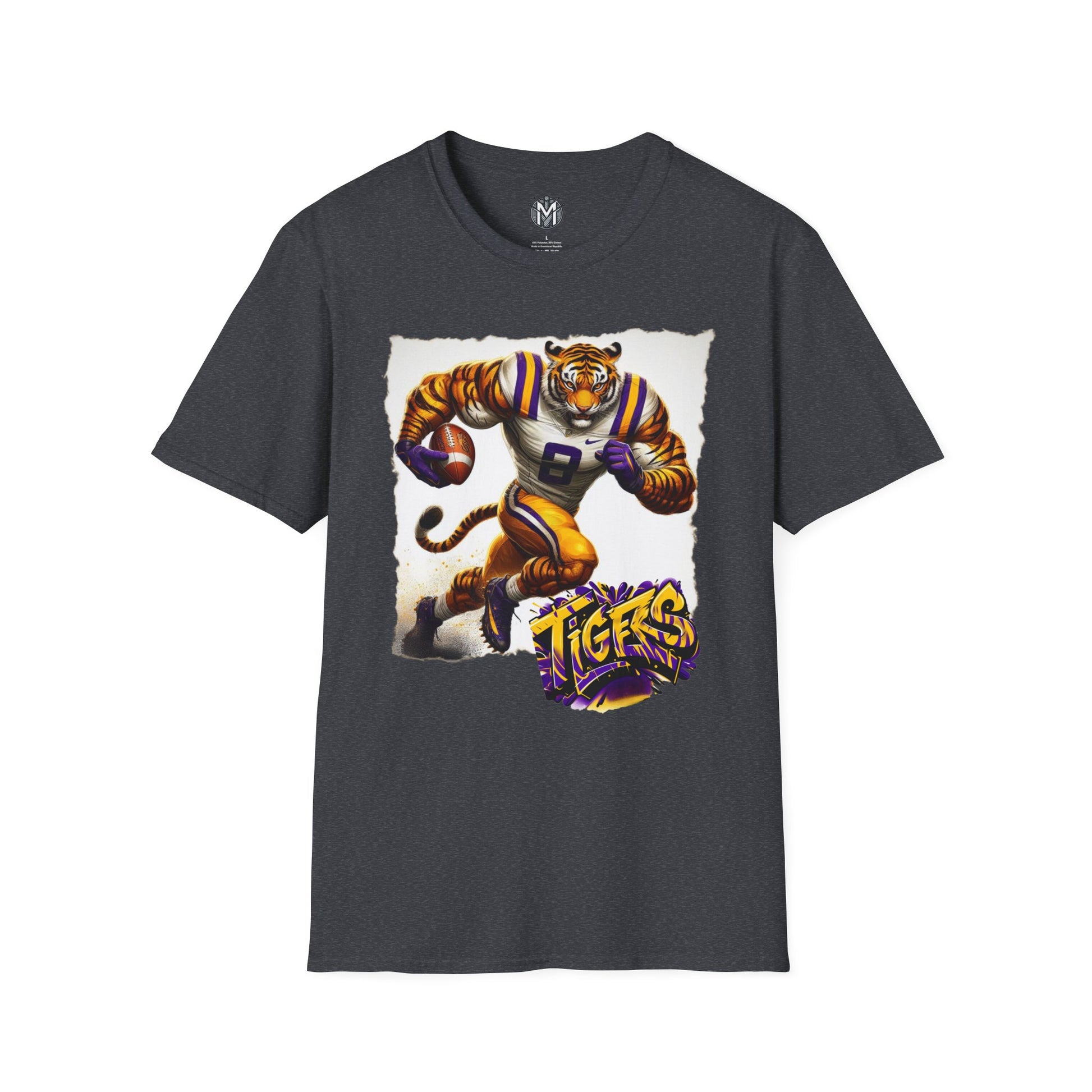 Show your team pride with this exclusive LSU Tigers Mens College Football Graphic Tee. Featuring a dynamic illustration of the team’s mascot in action, complete with a football and bold “TIGERS” text, this tee is perfect for game day or any day you want to support the LSU Tigers. Made with comfortable and ethically sourced materials this t-shirt is designed to last. It’s a must-have for any dedicated LSU Tigers fans and college football supporters.