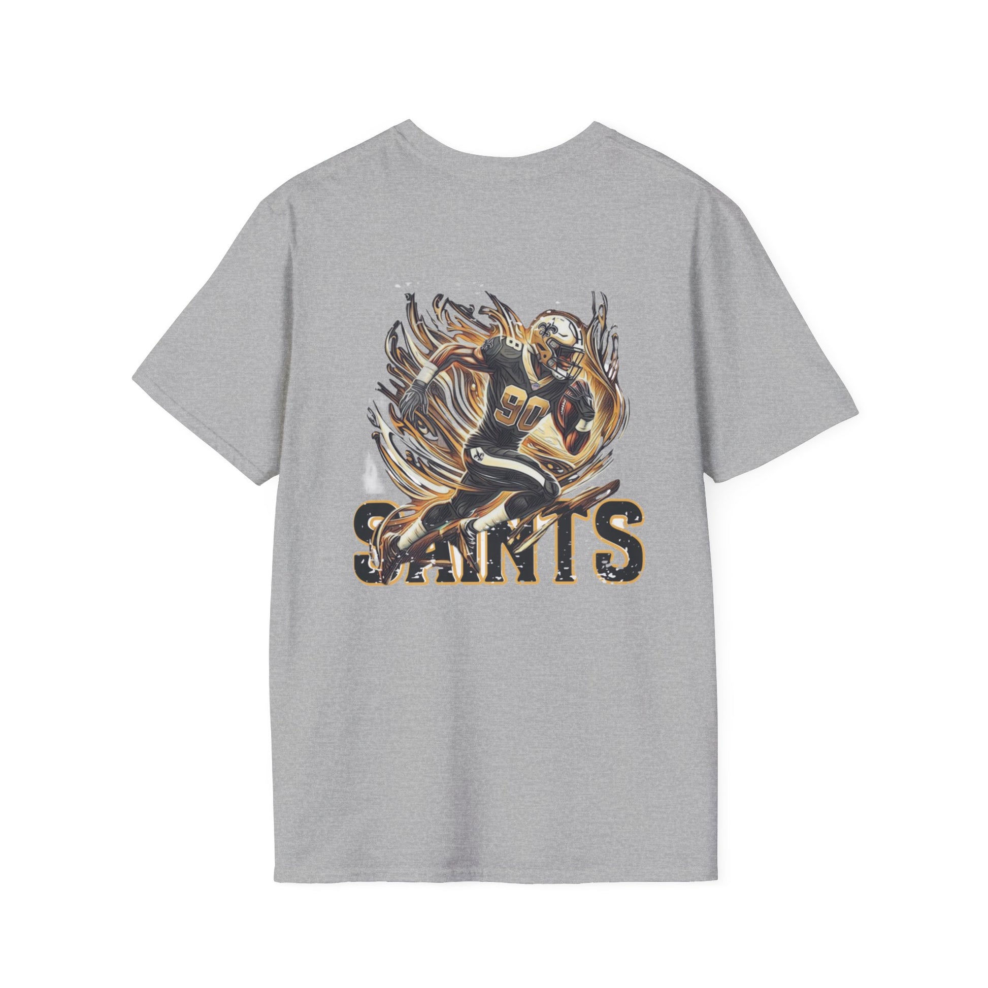 Elevate your game day wardrobe with the exclusive New Orleans Saints Mens American Football Graphic Tee. This high-quality t-shirt features a dynamic, full-sized graphic on the back, showcasing the energy and spirit of your favorite team. Complementing the bold statement at the rear is a tastefully sized matching emblem on the front left chest, adding a touch of team pride that’s visible from every angle. Crafted for comfort and style, this tee is perfect for any die-hard New Orleans Saints fan looking to support their team both at home and in the stands.