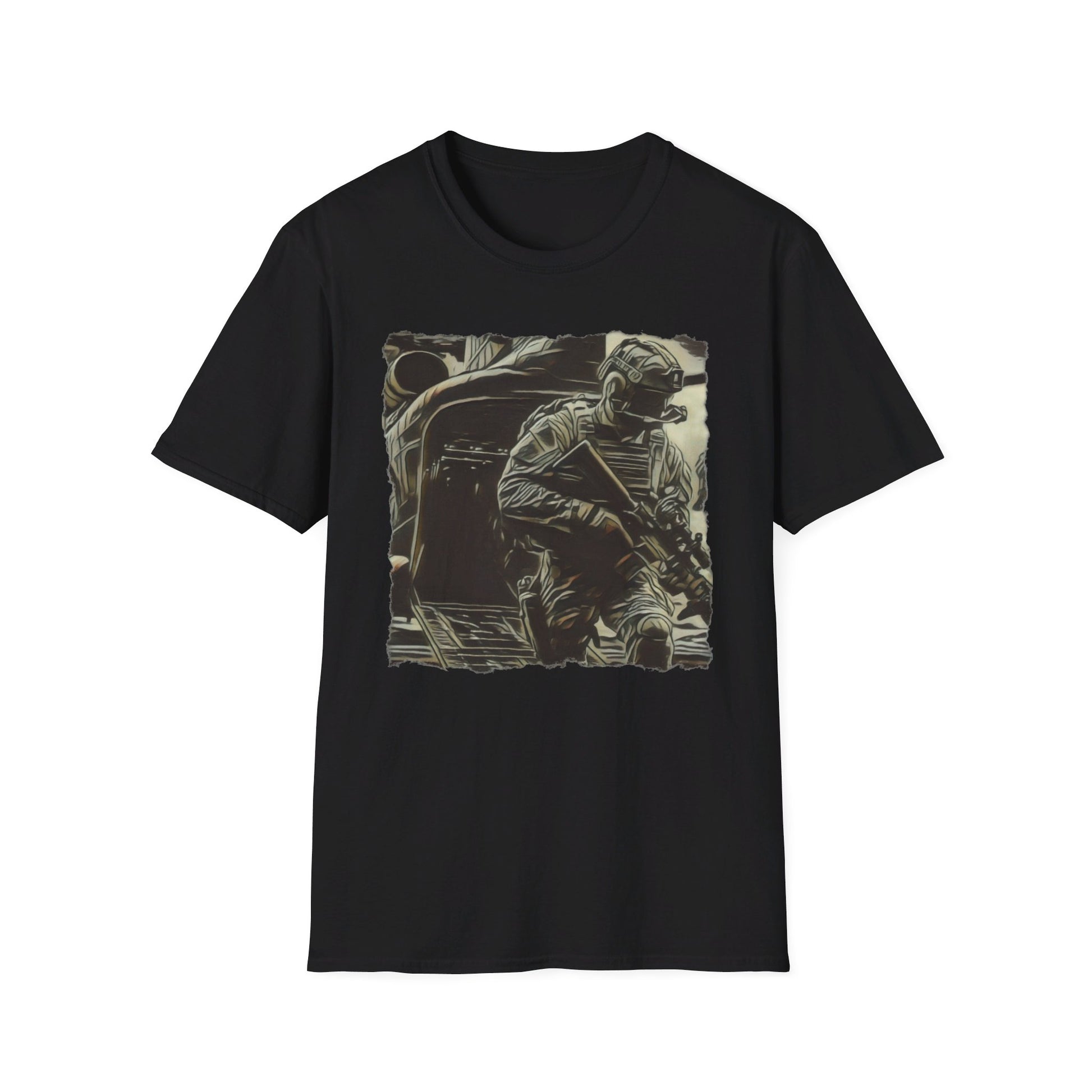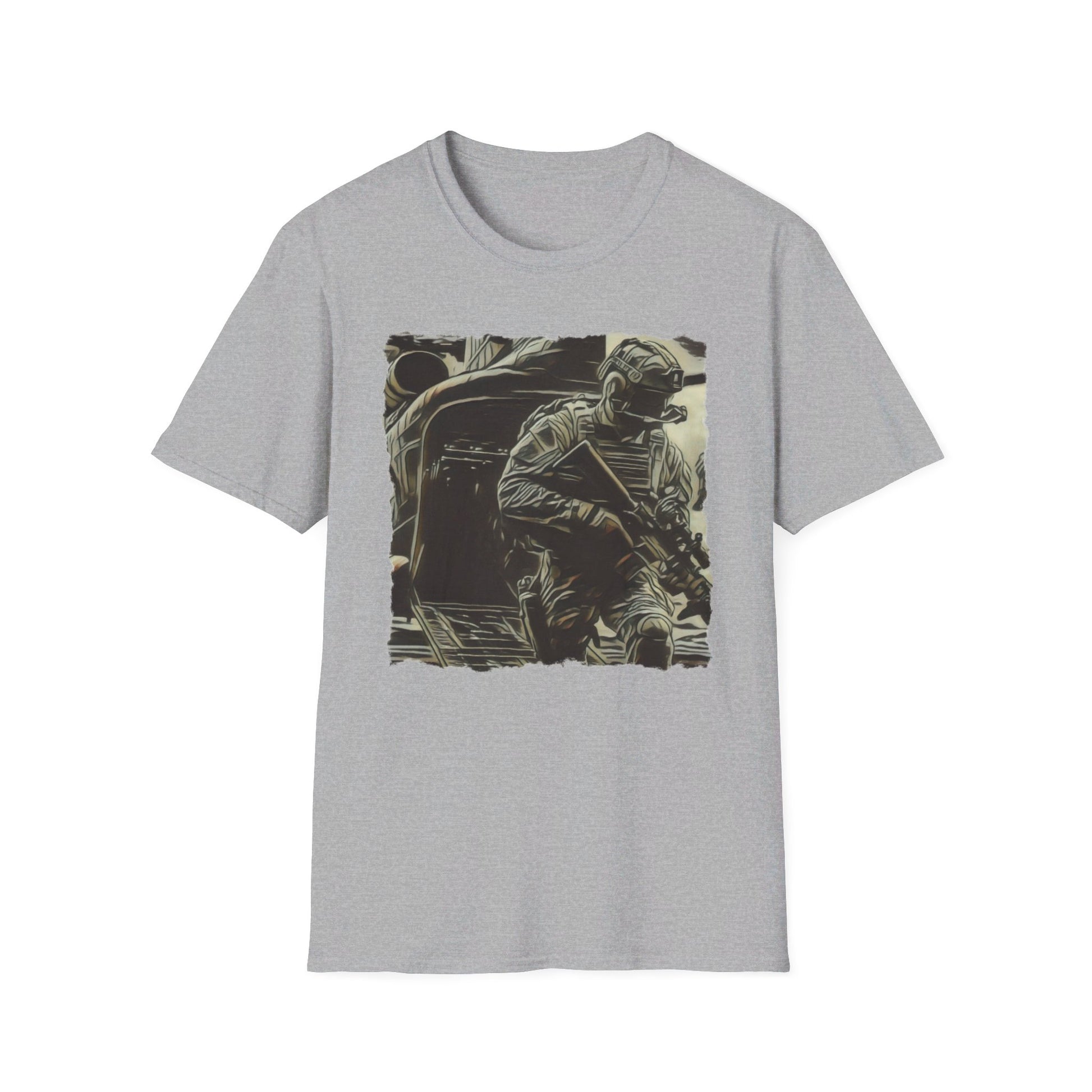 Honor courage with this men’s tee featuring a soldier exiting a Chinook helicopter. Perfect for veterans and those who appreciate bravery.