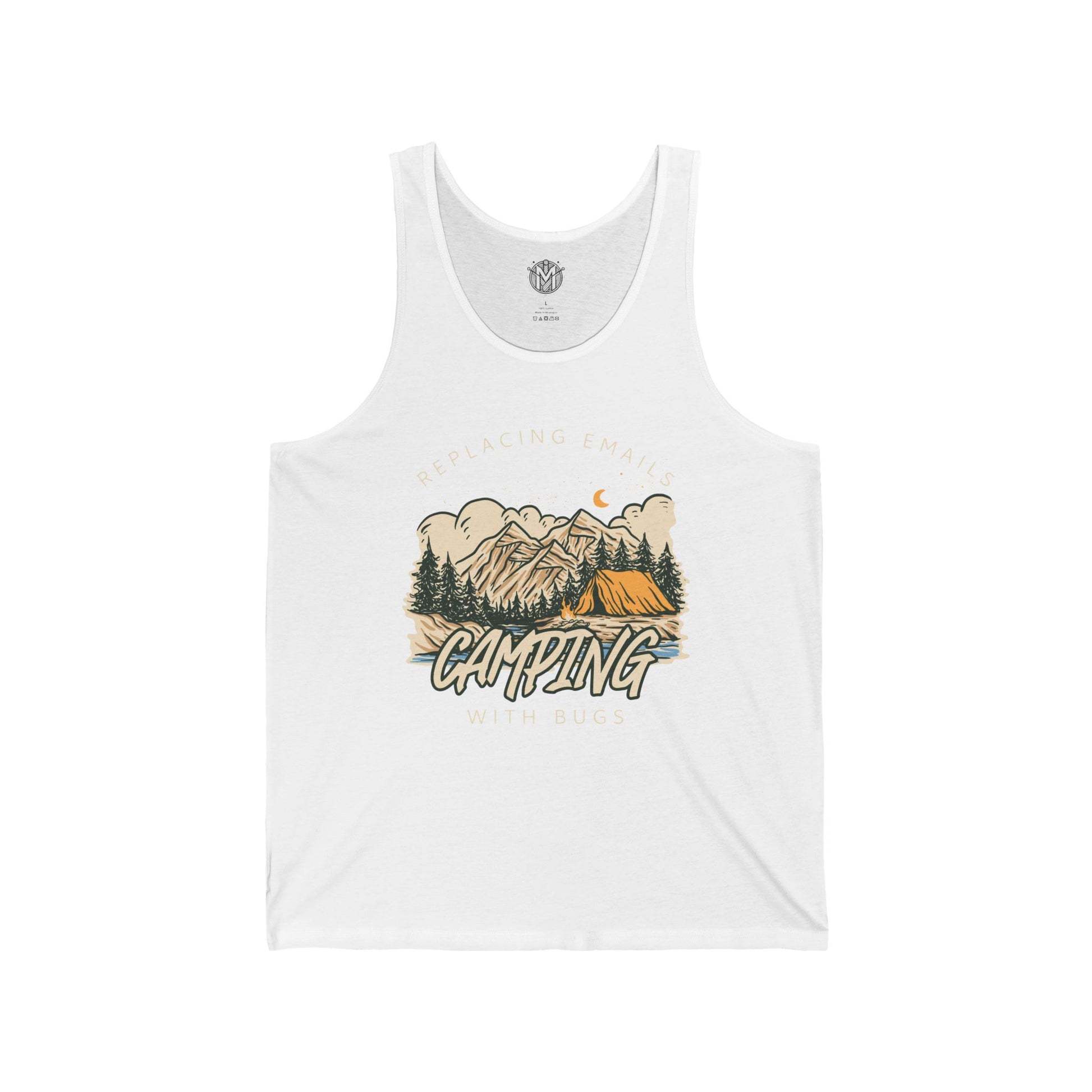 Embrace the great outdoors with our Replacing Emails With Bugs Mens Camping Outdoor Adventure Graphic Tank. This tank features a beautifully illustrated scene of mountains, trees, and a cozy tent under a starry sky, symbolizing the peace found in disconnecting from emails and enjoying nature's company. Camping enthusiasts will find the bold font saying "Replacing Emails With Bugs" fun and witty. Crafted for comfort and style, this tank is perfect for your next adventure or casual wear.